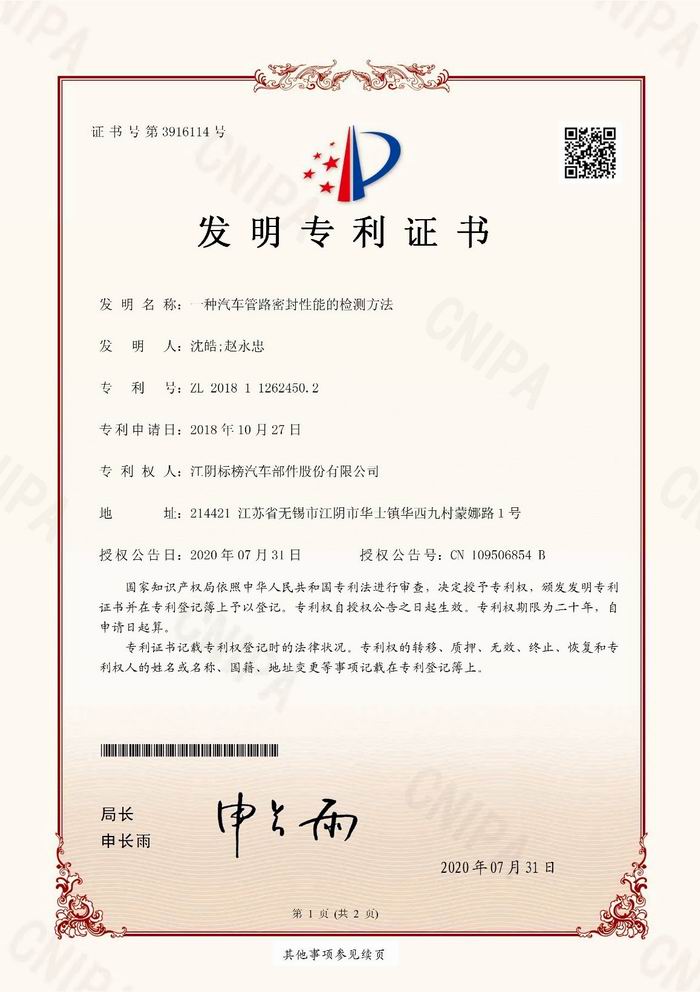 公司研發(fā)的“一種汽車管路密封性能的檢測(cè)方法”喜獲國(guó)家發(fā)明專利。